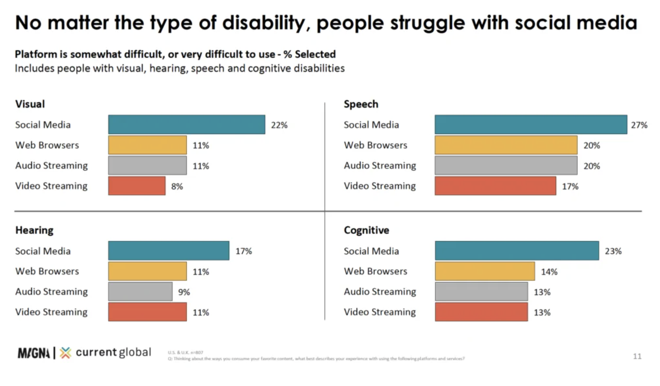 The study participants were from the U.S. and the U.K. and had visual, hearing, cognitive or speech disabilities. This segment of the population consumes all forms of media, including visual content like TV, social media and short online videos, but social media platforms can be difficult to use for people with all types of disabilities. Problems include small text, misleading buttons, ads interfering with posts, too many menu options and difficulty of navigation.